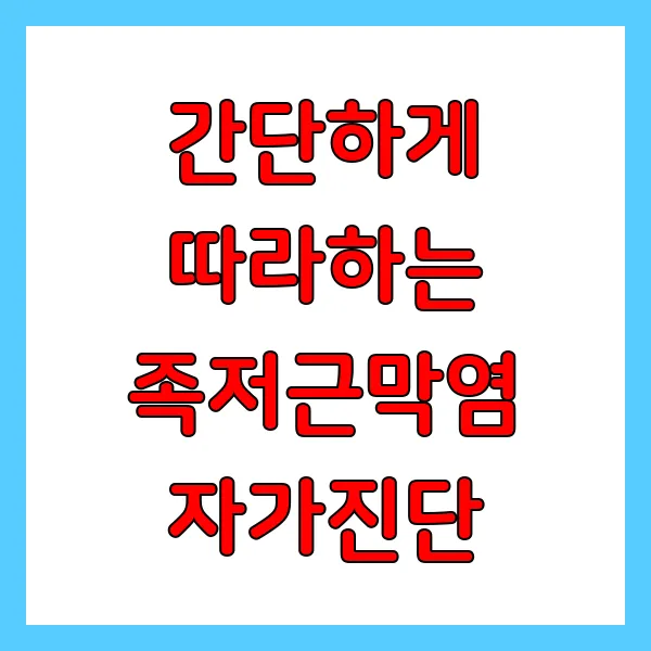족저근막염! 의심스럽지만 병원에 가기 전, 스스로 확인해 볼 수 있는 방법은 없을까요? 있습니다! 지금부터 소개할 몇 가지 자가진단법을 통해 족저근막염 가능성을 체크해보세요. 단, 이 자가진단은 의학적 진단을 대체할 수 없다는 점 , 꼭 기억해주세요! 전문의의 정확한 진단 및 치료가 최우선입니다.